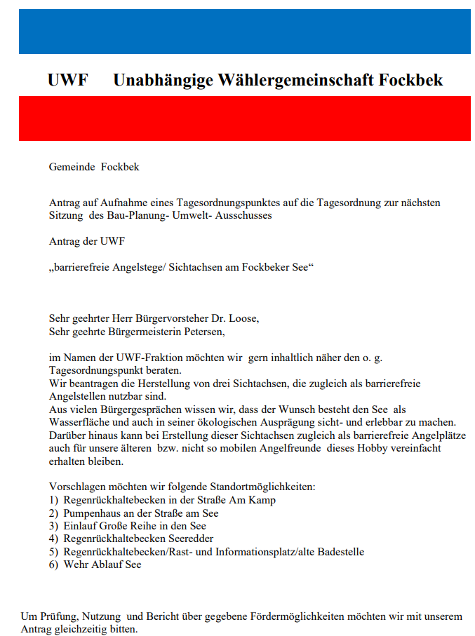 UWF am 18.6.2024 einen Antrag für die Herstellung von drei Sichtachsen rund um den Fockbeker See, die zugleich als barrierefreie Angelstellen nutzbar sind,